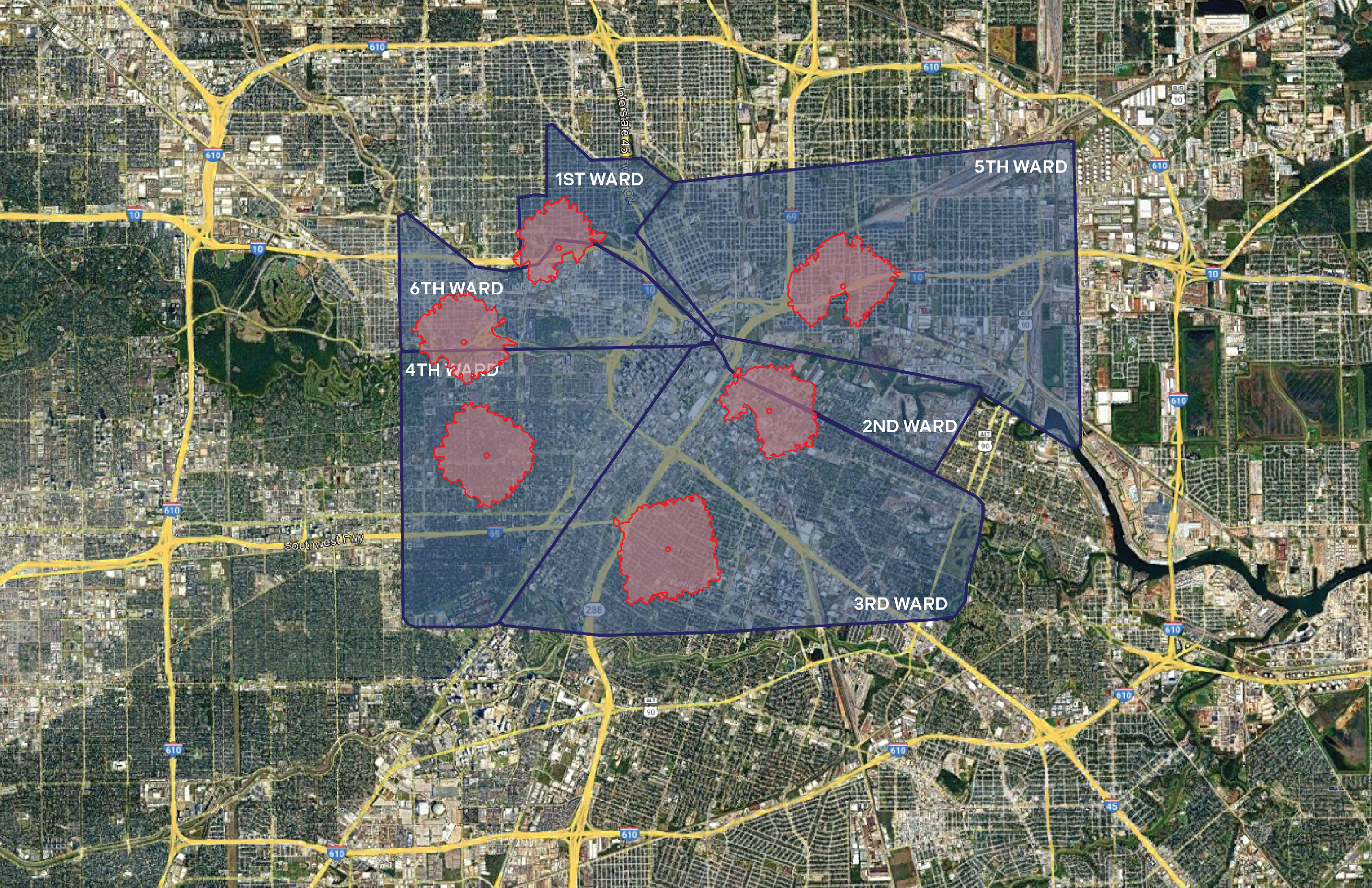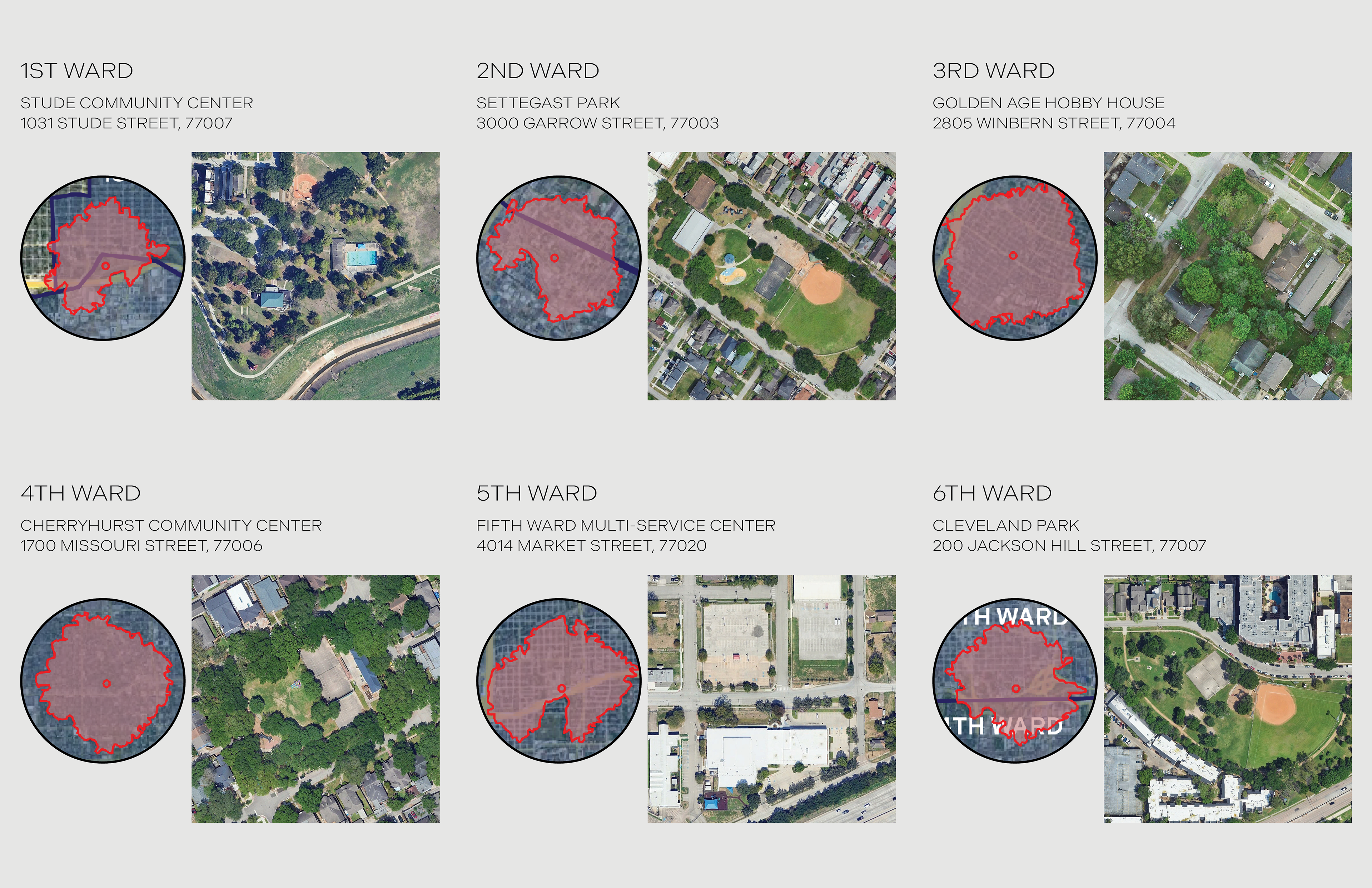 A key intention of this addition is that it can be repeated in other areas to impact more of the city. As an example, one site in each of Houston’s six wards was selected to demonstrate this potential. Of these sites, two are community centers, two are parks, one is a multi-service center, and one is the Hobby House. Each site sits within a primarily residential area and serves a 15-minute walking radius. The idea is that the exterior design would adapt to each location while maintaining the same core concepts in order to serve each community in a way that feels both consistent and local.