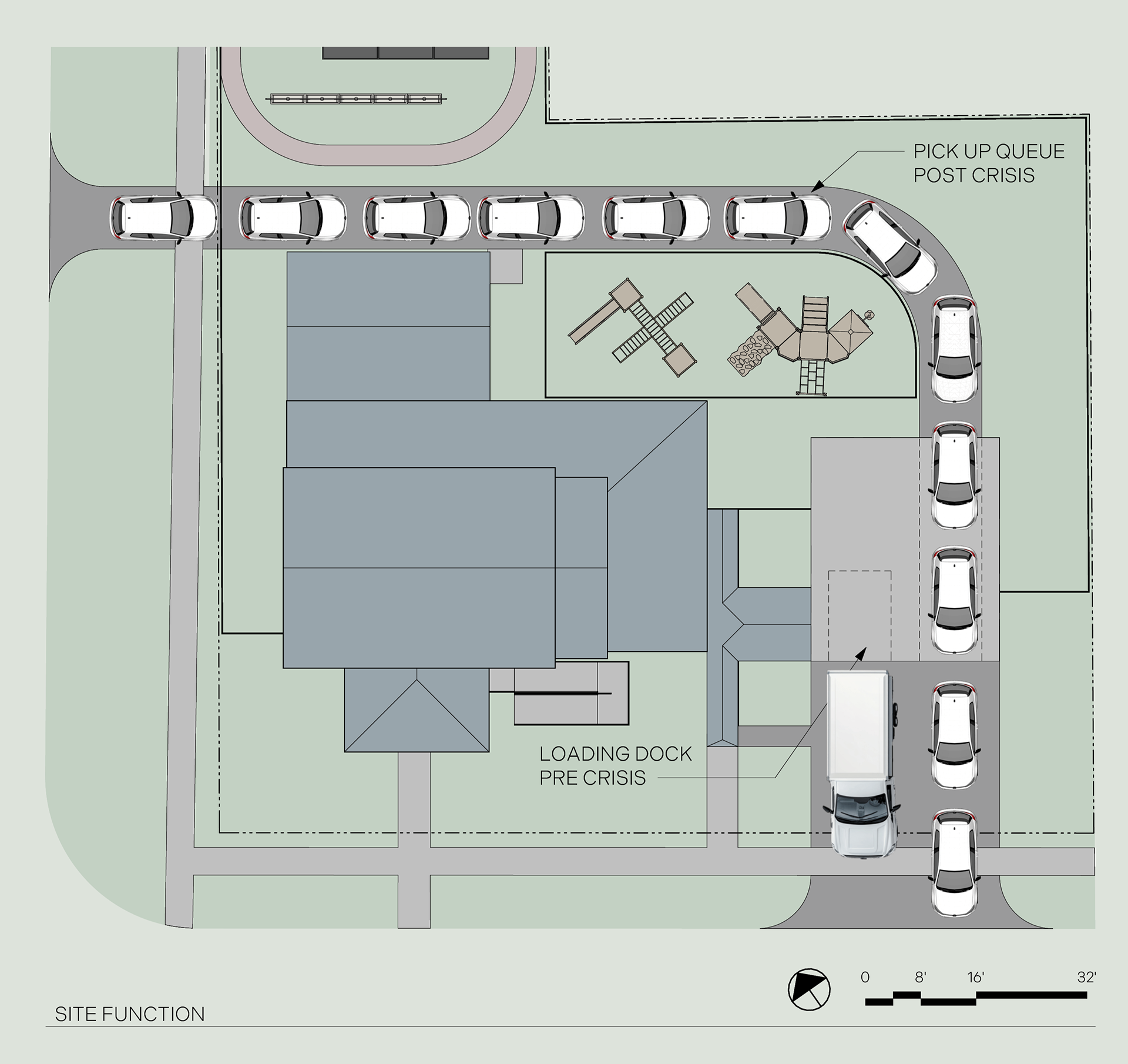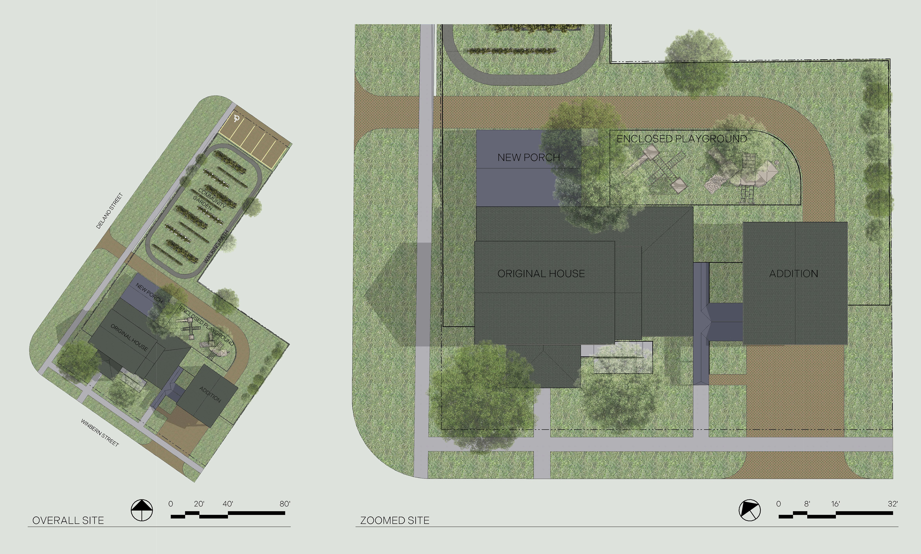 Because the addition faces Winbern Street, this allows space for a loading dock on the west side and a drive-through on the east side of the front façade. The drive-through moves through the building and exits onto Delano Street, creating an alcove for a desired playground within the drive path and placing it in view of the main structure. Other site improvements include relocating the community garden north to place it directly along the walking path and allow for expansion. A small number of parking spaces are located along the north edge of the site, out of the way of the main activity zones but still easily accessible from the path.