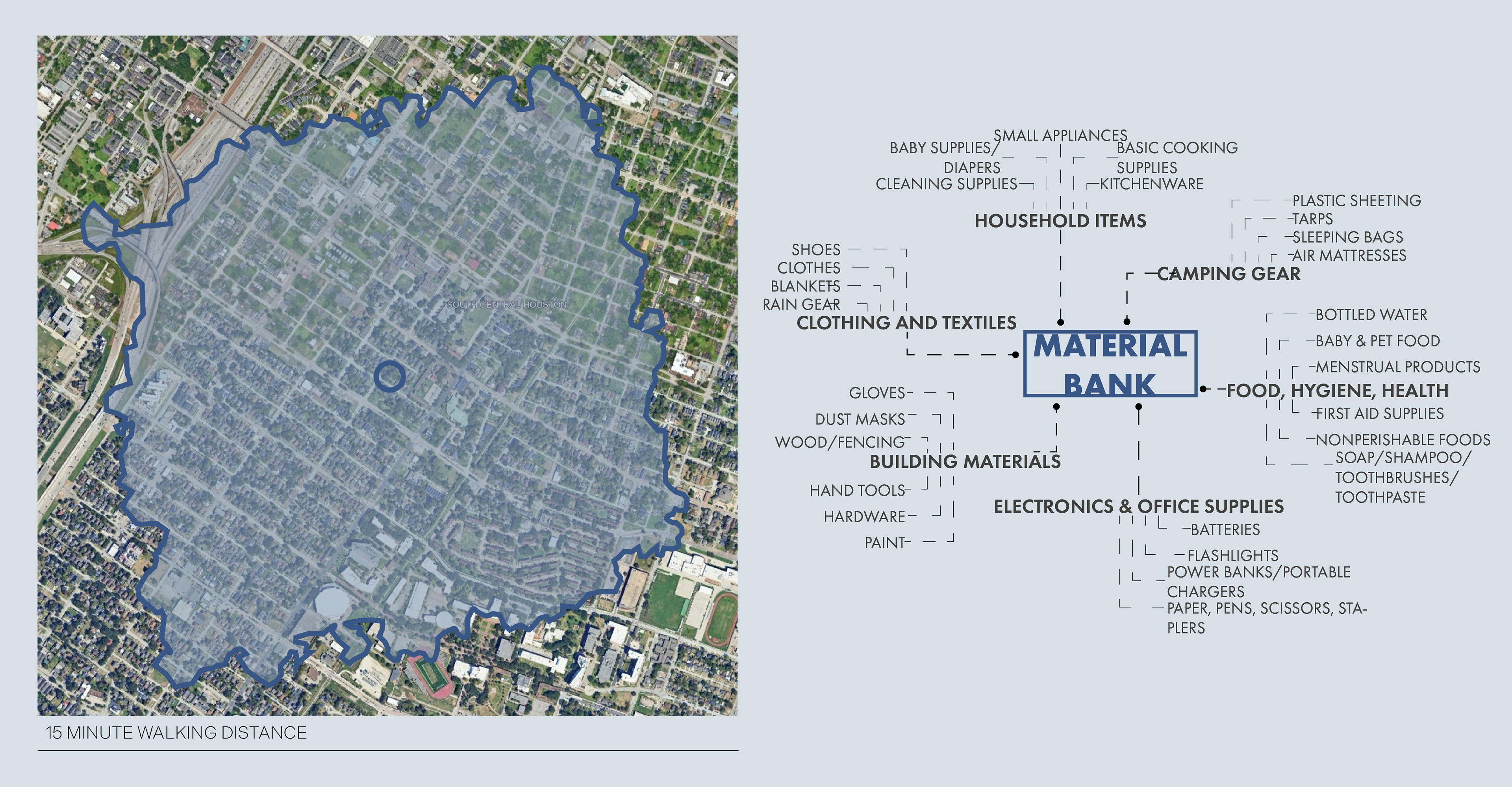 Because the material side of the bank requires physical infrastructure, this project proposes an addition to the side of the existing building so that the Hobby House can remain functional for the other criteria outlined by the EEDC. This addition is intended to serve a general 15-minute walking radius. The idea is that the ever-changing demographic needs of this zone would be tracked over time to inform what materials should be kept on hand.