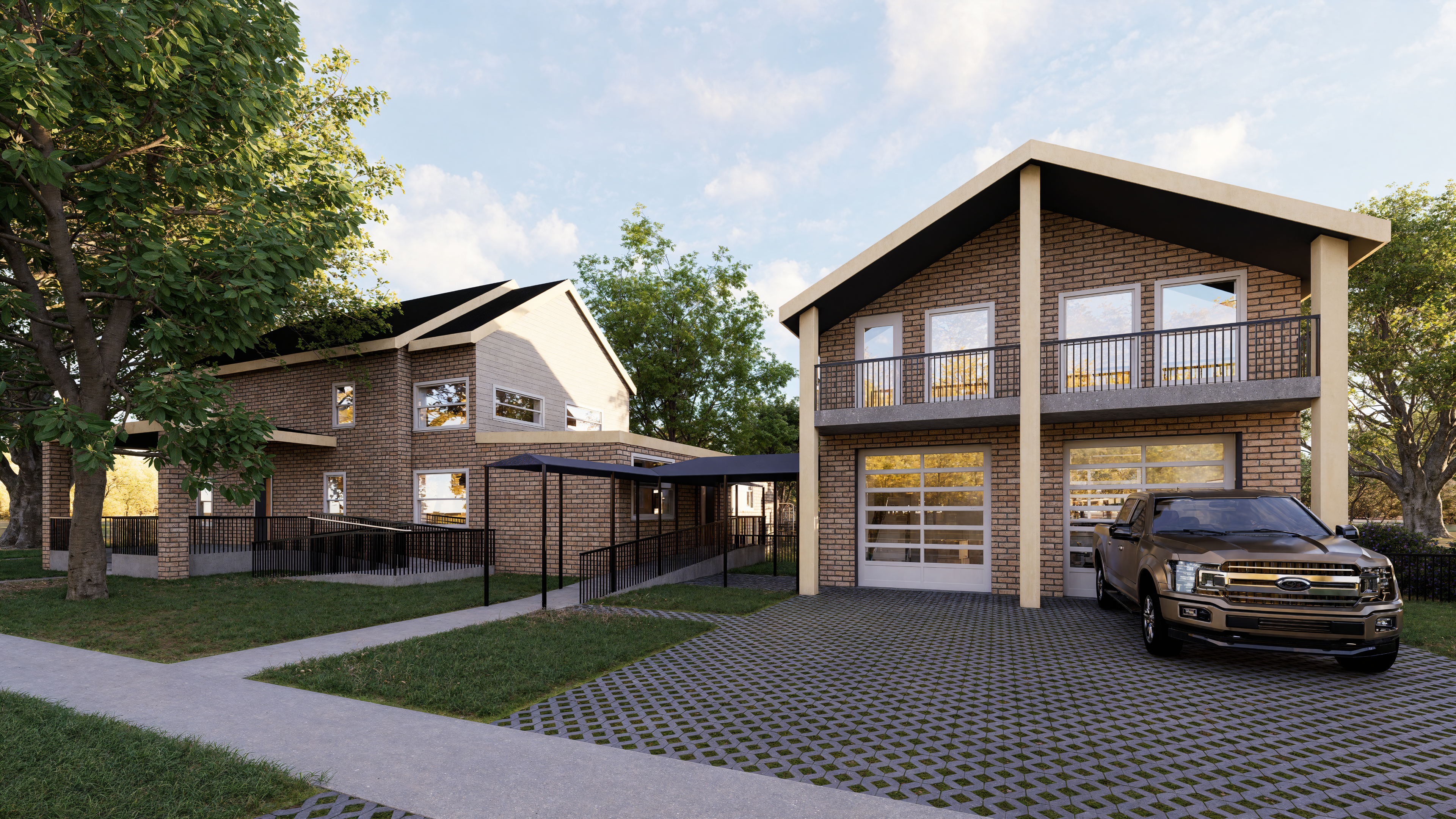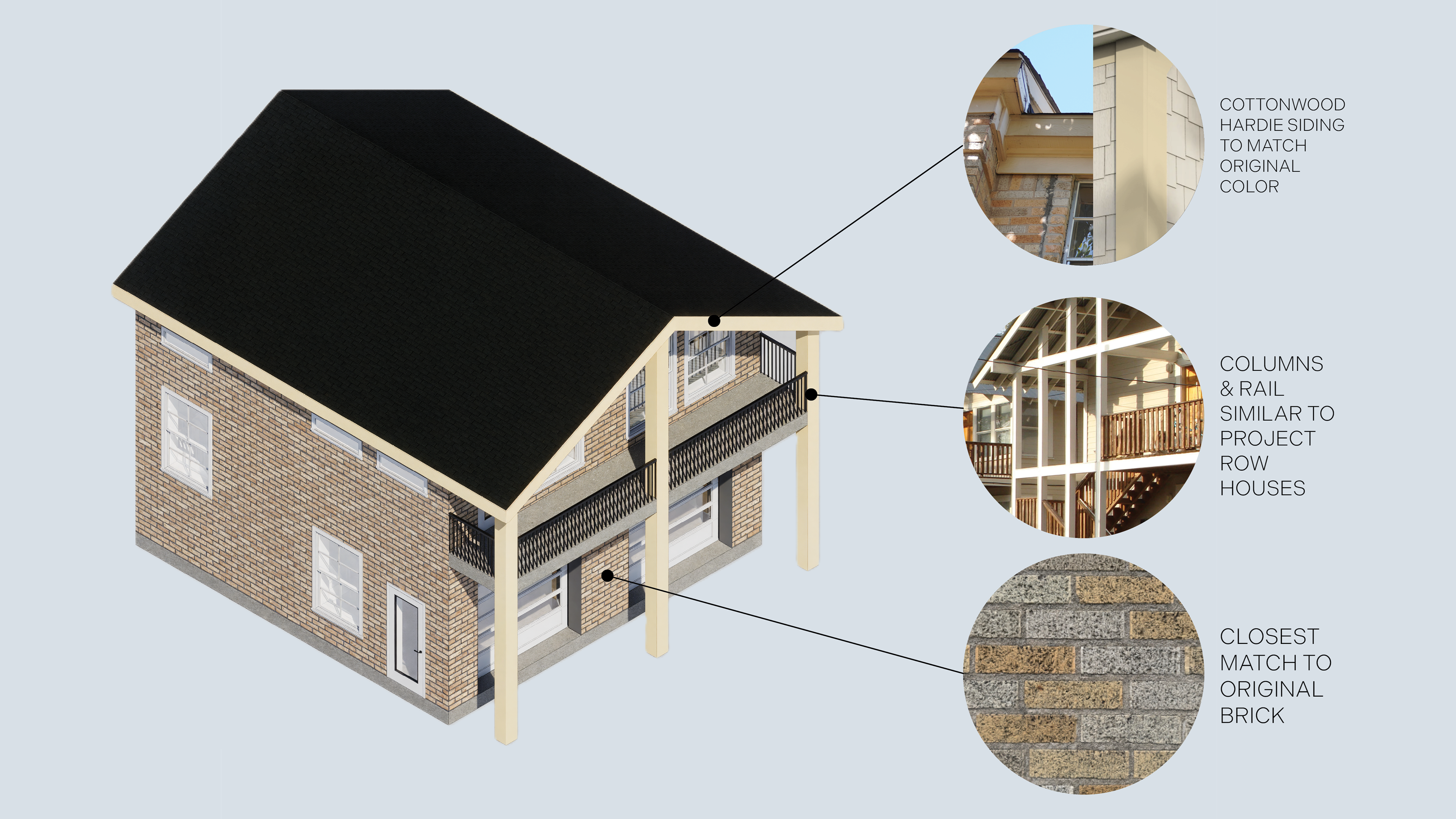 Materiality was very intentional in order to further fit the character of the site. The fiber cement trim and brick are designed to match the Hobby House as closely as possible. The columns and railing on the front façade are inspired by the nearby Project Row Houses. Permeable pavers are used for the driveway and drive-through lane to add an element of water sustainability.