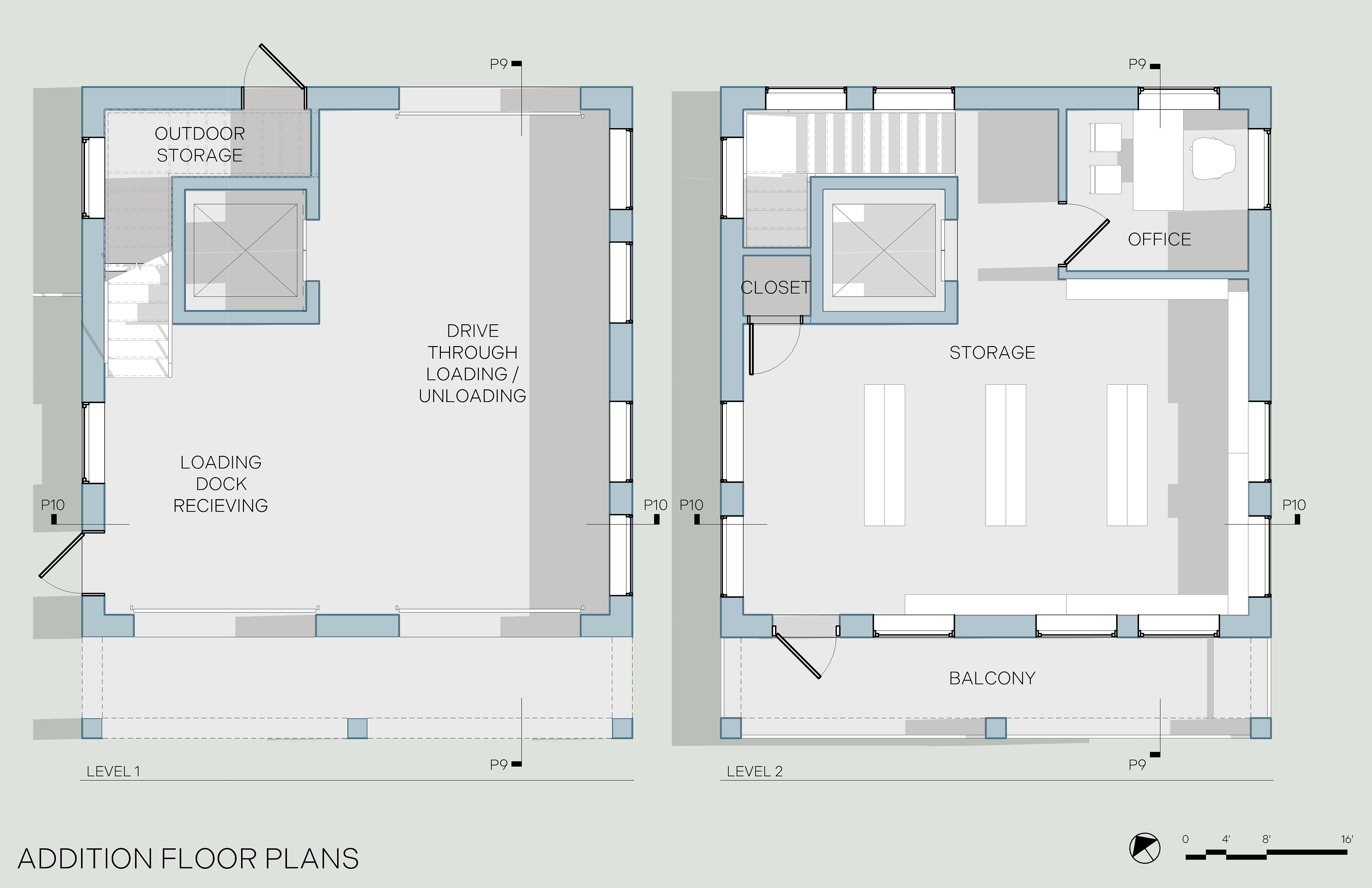 The garage doors on level one are 10 feet tall to accommodate any vehicles that need to interact with the building. The west loading dock door opens into a receiving and staging area. On the east side, the drive-through remains clear for loading and unloading. Beneath the stairs is a storage closet for playground equipment and outdoor activities. Level two is accessible by stairs or elevator and contains the main storage space. Tall ceilings and rows of shelving allow for maximum storage capacity, including the potential for refrigerated storage if needed. A balcony overlooking Winbern Street reinforces the neighborly character of the project. One office is included for administration of both the material bank and the monetary side of the Self-Insurance Bank. The addition does not include plumbing in order to keep costs down, with restrooms located in the Hobby House.