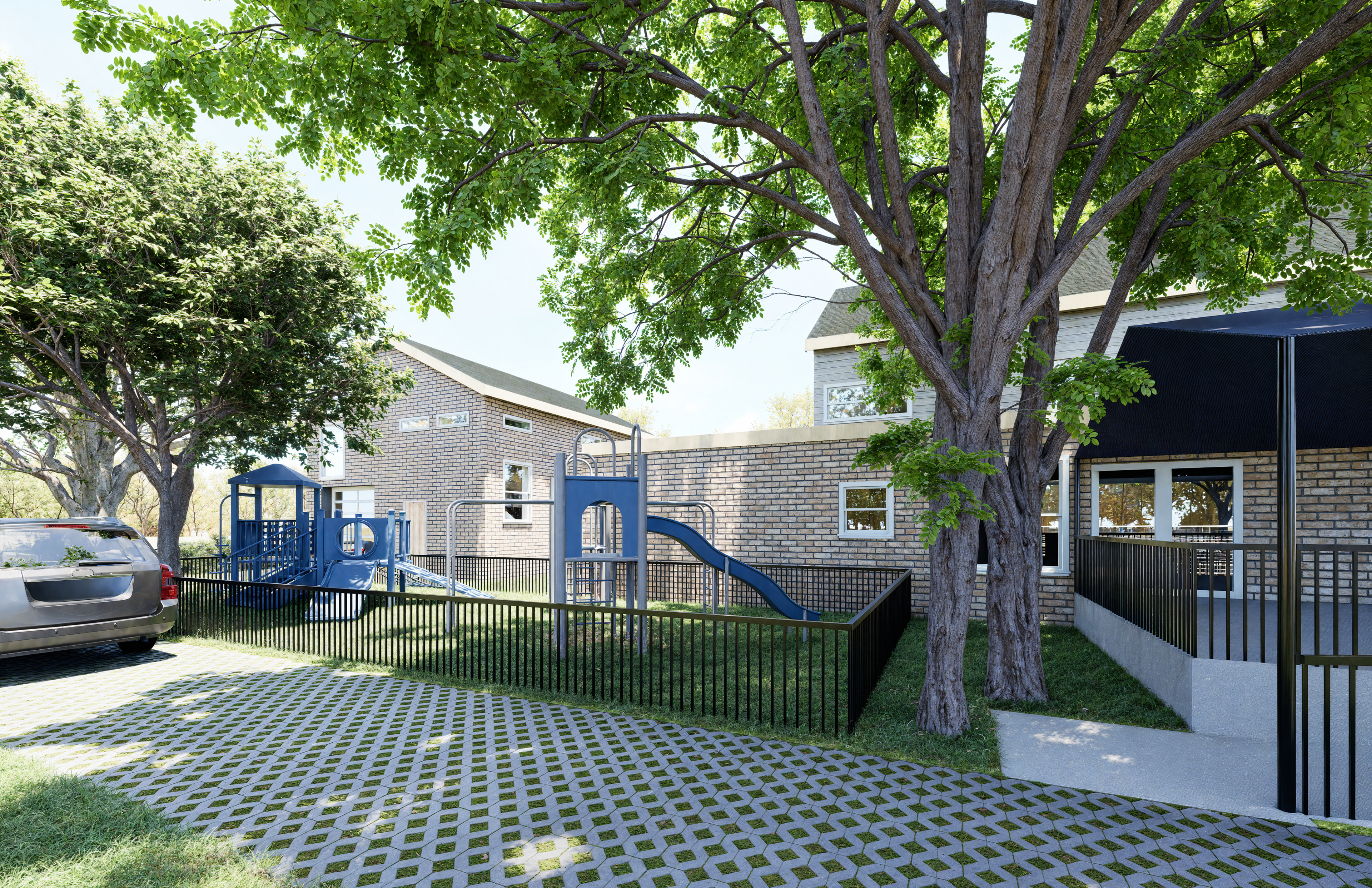 At the existing Hobby House, a new back porch is proposed, since the current one will need to be relocated. Adding double doors on the back façade from the main gathering space allows direct access to this porch. On the east side of the site, a covered walkway connects the new and existing buildings through an existing entrance off the Hobby House. Altogether, these site improvements allow for more functional use of the property and better integration of the addition.
