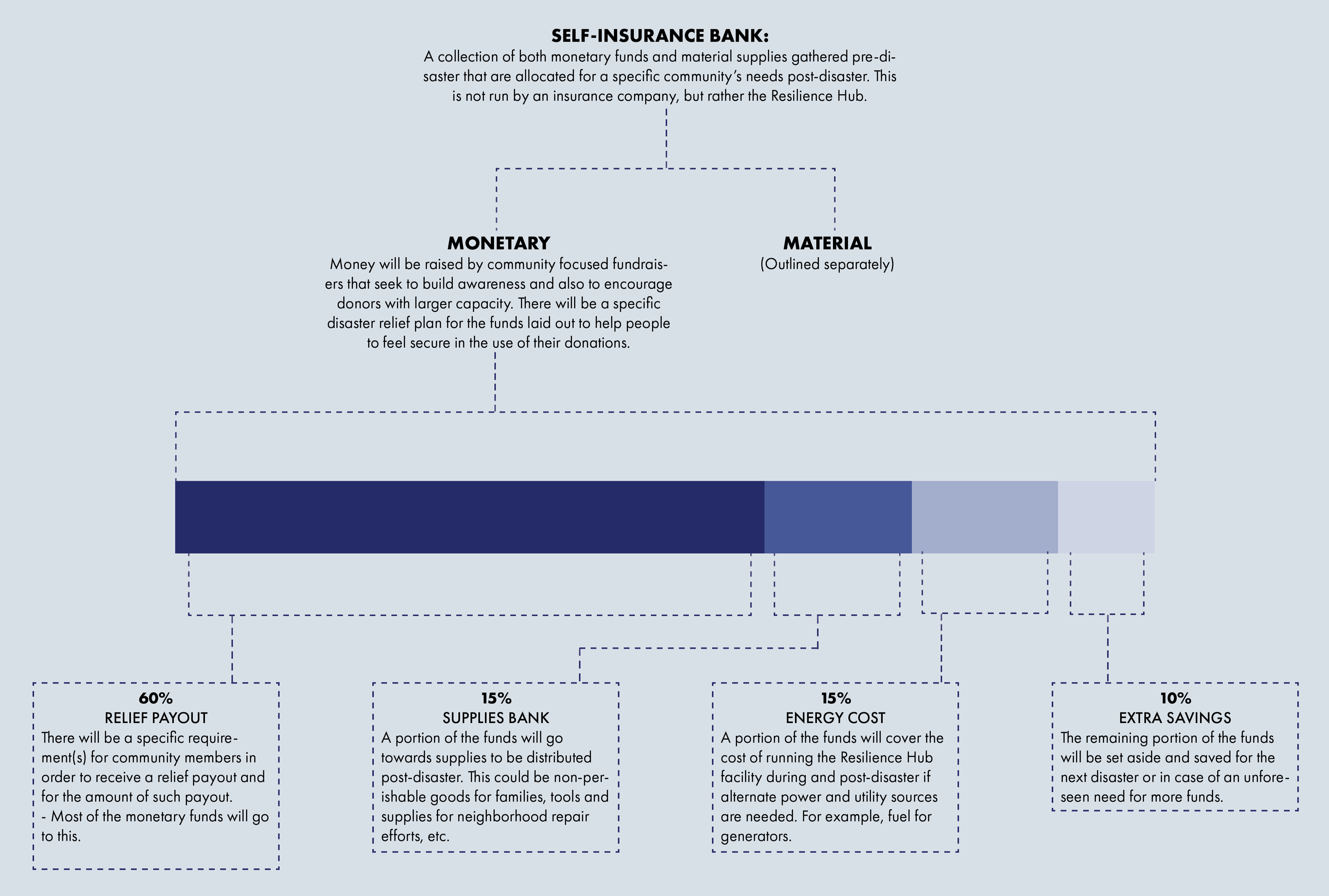 In background work completed in teams prior to developing this design individually, the concept of a Self-Insurance Bank was developed - a community-based resource for both monetary and material needs. This bank would be stocked ahead of time through donations and fundraising efforts, ensuring there is existing supply when a crisis such as a hurricane or flood arises.